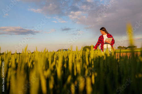 Young agronomist woman walking through a vibrant wheat field at sunset, holding a tablet and closely examining the crop's development while analyzing data for optimal growth