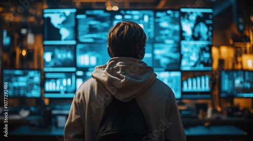 Young Analyst Observing Data Analytics Dashboard in Modern Workspace
