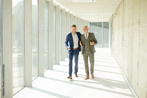 Young and a senior businessman walk down an office hallway, deep in conversation