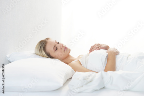 Young and beautiful blond girl in the bed. Sleeping woman in a rays of morning sun.