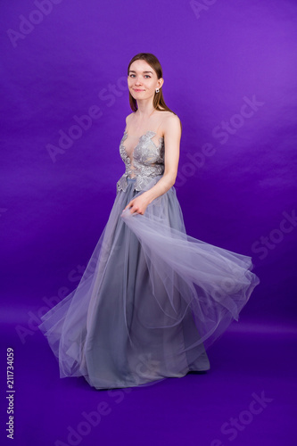 young and beautiful woman bride with makeup in long chic dress dancing ballroom waltz dance in studio on a purple background