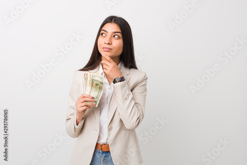 Young arab business woman holding dollars looking sideways with doubtful and skeptical expression.