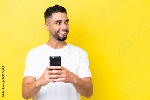 Young Arab handsome man isolated on yellow background using mobile phone and looking up