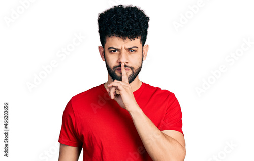 Young arab man with beard wearing casual red t shirt asking to be quiet with finger on lips. silence and secret concept.