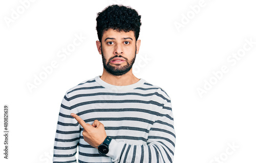Young arab man with beard wearing casual striped sweater pointing aside worried and nervous with forefinger, concerned and surprised expression