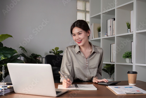 Young Asian business woman sitting in the office using a calculator to calculate business numbers.