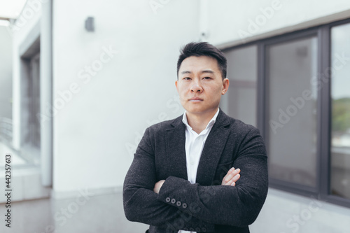 Young Asian businessman looks at the camera in a business suit, arms folded crosswise near the office center