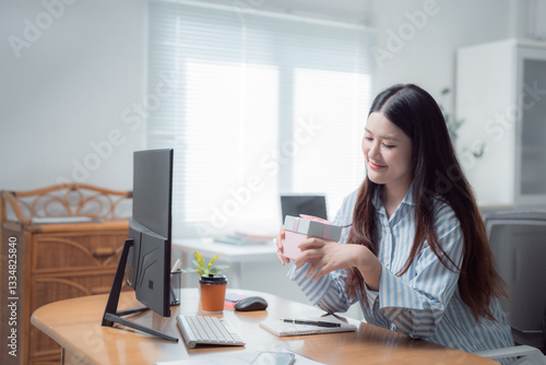 woman, business, gift, office, home, computer, working, remote, work, asian, businesswoman, young, video, call, showing, present, celebration, online, technology, communication, birthday, surprise, greeting, happiness, desk, laptop, freelance, men at work, professional, cyberspace, connection, corporate, job, career, indoor, sitting, window, natural, light, modern, lifestyle, distance, virtual, meeting, conference, holiday