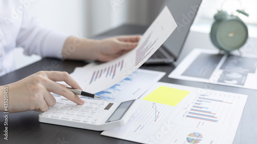 Young Asian businesswoman presses a calculator to calculate income tax and corporate income in a private office, Finance, Accounting, Tex, Statistical graphs of marketers investing in real estate.