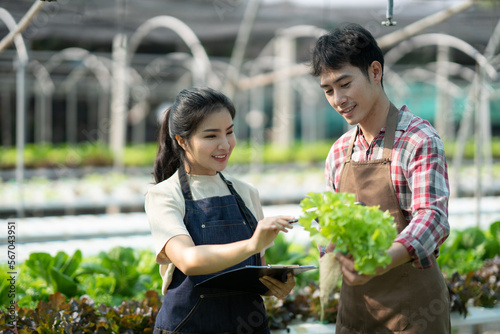 Young Asian farmers working in vegetables hydroponic farm with happiness. Portrait of man and woman farmer in farm..