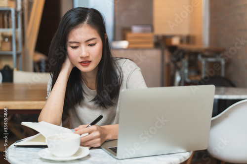 Young asian girl studying at home. University Women student learn and research from internet and take a note by e-learning program.