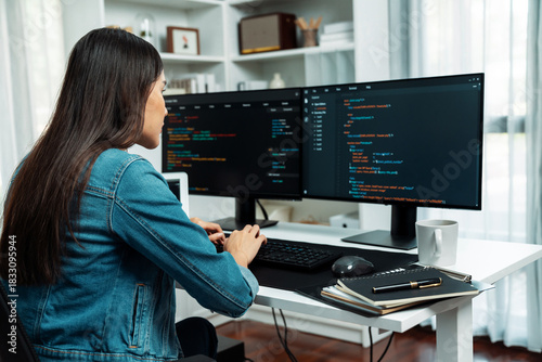 Young Asian in IT developer creating with typing online information on pc with coding program data of website application, wearing jeans shirt. surrounded by safety analysis two screens. Stratagem.