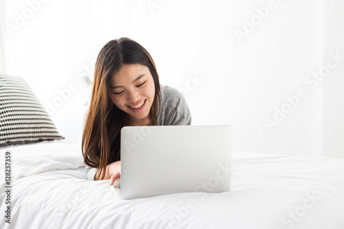 adult, attractive, beauty, bed, bedchamber, chatting, chinese, comfortable, computer, cute, day, electronic mail, fashion, fashion model, female, happiness, house, indoor, innocence, japanese, lifestyle, long hair, lying down, morning, natural beauty, natural light, notebook, online shopping, pillow, portrait, relaxation, smiling, student, studio shot, technology, teenage, woman, cyberspace, joy, toothy smile