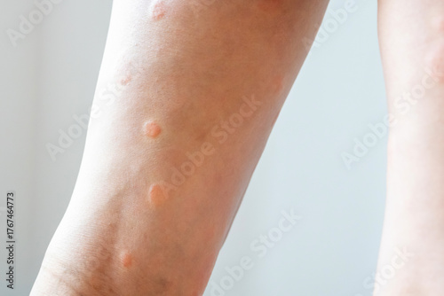Young asian man has allergic skin rash on his legs from itchy dry skin eczema dermatitis insect bites
