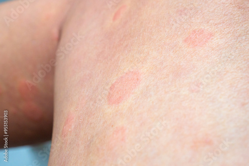 Young asian man has allergic skin rash on his legs from itchy dry skin eczema dermatitis insect bites