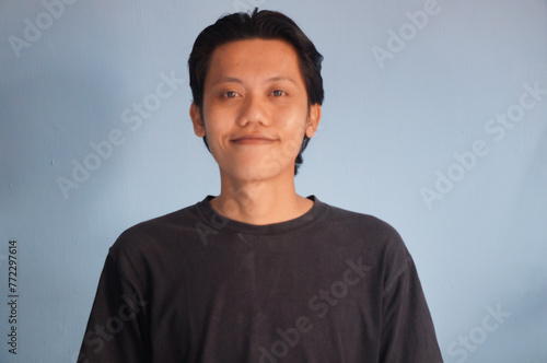young asian man smiling looking at camera in black t-shirt