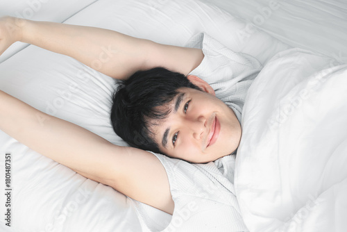 Young Asian man stretches his arms while waking up on his bed in bedroom with a bright expression giving a comfortable feeling enjoying morning rest at home. Healthcare concept.