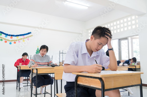 Young Asian students group serious troubled while writing exam on test paper answer sitting on taking final examination in classroom with concentration at exams room in Thailand