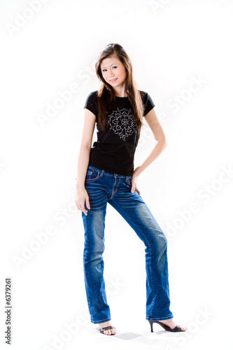 casual attire, jean, t-shirt, smiling, happy, cheerful, hand, face, free, freedom, 20s, 30s, asian, beauty, chinese, fashion model, japanese, malaysian, young adult, female, girl, woman