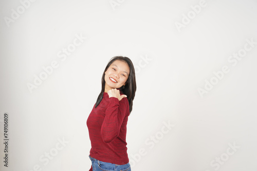 Young Asian woman in Red t-shirt Pointing side at copy space with thumb isolated on white background
