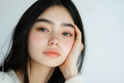 young, asian, woman, long hair, black hair, isolated, portrait, female, beauty, natural, closeup, face, youth, model, expression, skin, freckle, eye, lip, serene, calm, minimalist, clean, simple, elegant, soft, delicate, fresh, modern, fashion, lifestyle, head shot, attractive, pretty, charming, innocent, gentle, pure, clear, studio, professional, hi-res, advertising, marketing