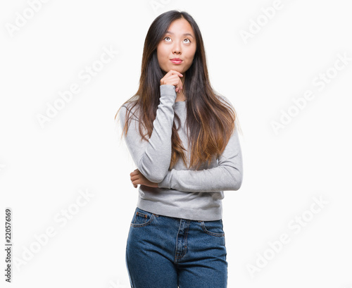 Young asian woman over isolated background with hand on chin thinking about question, pensive expression. Smiling with thoughtful face. Doubt concept.