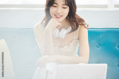 Young Asian Woman Relaxing on Sofa with Headphones and Laptop in Bright Living Room