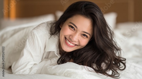 woman, missy, asian woman, person, female, adult, head, face, hair, smile, happy, relaxed, comfortable, casual attire, natural, healthy, dark hair, indoor, white shirt, bed, bedchamber, home, lifestyle, sleep, wake up, rest, leisure, wellness, beauty, youth, contentment, joy, portrait, one person, people, real people