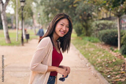 young asian woman smiling happy looking at camera with sunglasses in her hands, concept of youth and beauty