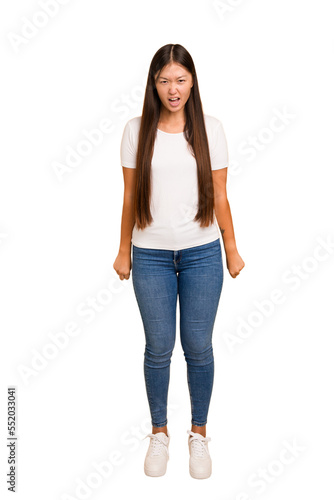 Young asian woman standing, full body cutout isolated shouting very angry, rage concept, frustrated.