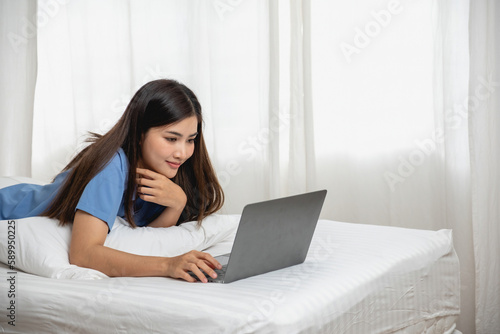 Young Asian woman with beautiful face, long hair, blue shirt lying on bed in white bedroom at home with cup of coffee and video call with laptop talking to relatives on vacation. holiday concept.