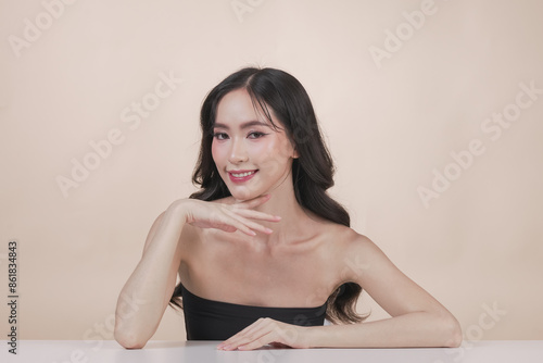 young asian woman with clean fresh skin on beige background, Cosmetics, Face care, Facial treatment, Cosmetology, beauty and spa, Asian women portrait. woman with make up brush cosmetic Beautiful