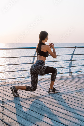Young athletic girl performs squats on wooden embankment by the sea in early morning. Healthy lifestyle, coaching, training concept.