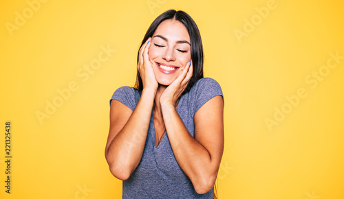 Young attractive cute brunette woman in gray T-shirt is posing and looking on camera isolated over yellow wall