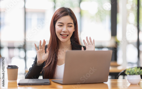 Young attractive Freelancer business asian woman talking about sale report in video call conference on laptop computer online meeting in the workplace, finance Work remotely Social isolation concept.