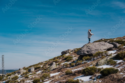 Young backpacker enjoying a sunny winter day in the mountains. Breathing fresh air, relaxed and carefree. Some snow all around. Amazing view. Lifestyle.