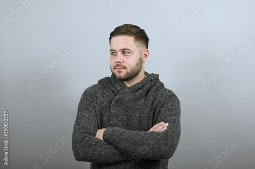 Young Bearded Dark Haired Man In Black Stylish Shirt On White Background, Upset Male Hands Crossed And Makes A Grimace On His Face. The Concept Of People Who Are Offended