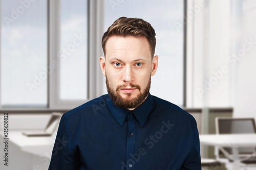 Young Bearded guy Businessman, Wearing Blue Shirt