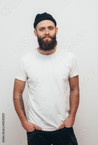 Young bearded hipster guy wearing white blank t-shirt. Mock-up for print. T-shirt template.