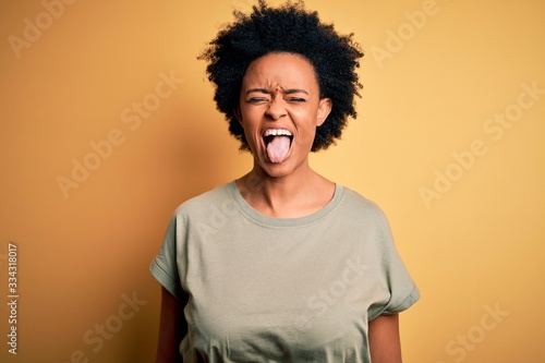 Young beautiful African American afro woman with curly hair wearing casual t-shirt sticking tongue out happy with funny expression. Emotion concept.