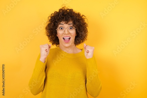 Young beautiful Arab businesswoman with curly hair wearing yellow sweater celebrating surprised and amazed for success with arms raised and open eyes. Winner concept.