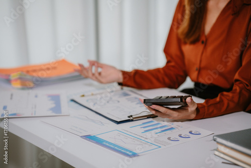 Young beautiful asian businesswoman holding unofficial spreadsheet paper accounting documents Division of documents to prepare the search Summarize the plan in a meeting at the office.