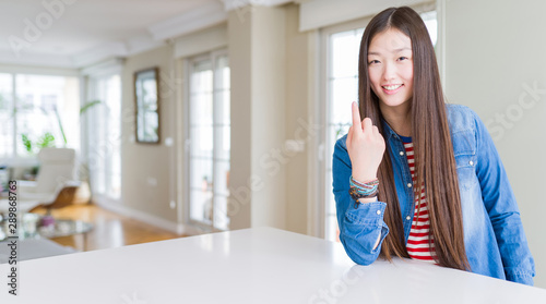 young, woman, adult, long hair, chinese, asian, beautiful, indoor, portrait, home, background, house, sitting, white, table, casual attire, striped, t-shirt, denim, jacket, arriving, here, gesture, hand, finger, gesticulate, signs, expression, invite, people, invitation, sexy, calling, symbol, inviting, beckon, arm, happy, coming, smile, call, sensuality, cheerful, welcome, welcoming, polite, confident, friendly, smiling