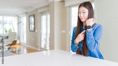 young, woman, adult, long hair, chinese, asian, beautiful, indoor, portrait, home, background, house, sitting, white, table, casual attire, striped, t-shirt, denim, jacket, watch, time, pointing, business, late, clock, wrist, person, looking, hand, finger, camera, checking, point, work, wristwatch, job, hurry, punctuality, delay, impatient, meeting, face, hours, deadline, punctual, success, expression, upset, rush