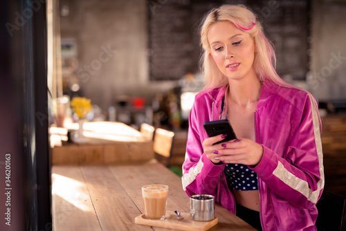 woman, beautiful, blond, pink, hair, people, portrait, young, caucasian, 20s, female, lady, woman, person, adult, cafes, city, hot drink, cool, dyed, elegance, fashionable, hipster, inside, lifestyle, model, modern, rebel, sexy, shop, store, stylish, thinking, urban, phone, mobile, technology, using, holding, smartphone, smart, cyberspace, mobile phone, communication, connection, message, texting