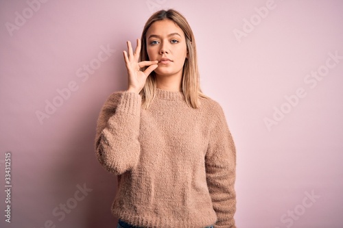 Young beautiful blonde woman wearing winter wool sweater over pink isolated background mouth and lips shut as zip with fingers. Secret and silent, taboo talking