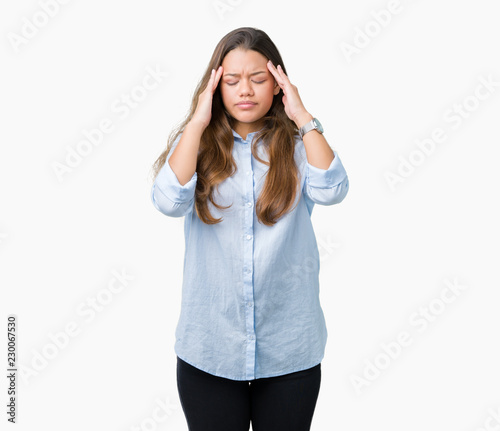 Young beautiful brunette business woman over isolated background with hand on head for pain in head because stress. Suffering migraine.