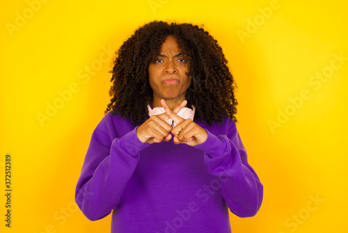 yellow background, earphones, music, african, american, hispanic, latin, brazilian, afro, hair, gorgeous, studio, denial, deny, no, stop, gesture, young, warning, rejection, isolated, portrait, palm, defensive, female, negative, adult, people, showing, person, signs, refusal, beautiful, serious, forbidden, defense, decayed, ban, reject, making, prohibition, human, concept, violence, woman, against, day, international, woman, domestic