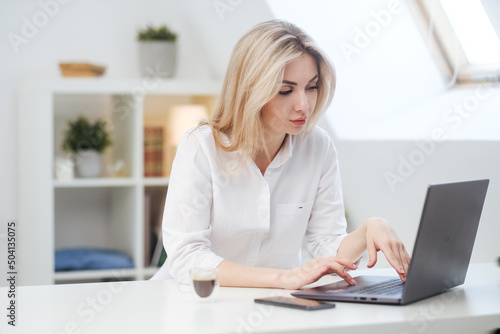 Young beautiful caucasian blonde woman working on laptop at home and drinking coffee. Remote work or freelance.