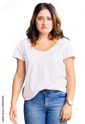 Young beautiful caucasian woman wearing casual white tshirt depressed and worry for distress, crying angry and afraid. sad expression.